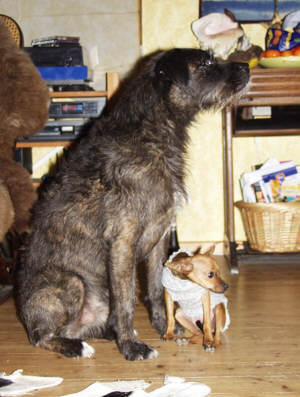 Eine andere Folge betrifft das Zentrale Nervensystem. Fine hat Störungen in der Motorik, besonders in der Bewegungskoordination der Beine. D.h. sie hat einen schwankenden Gang (wirkt wie betrunken) und fällt auch häufiger um, speziell wenn sie müde ist oder aufgeregt. Dann fällt sie auch in ihr Häufchen oder das kleine Geschäft und muß dann saubergewischt werden. Sie ist zwar noch im Wachstum und wir arbeiten am Muskelaufbau, aber es ist nicht damit zu rechnen, das sich alles zurückbildet und sie laufen wird wie ein "normaler" Hund.