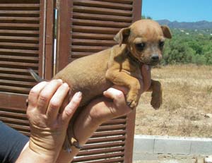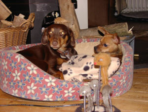 Sie ist unser "Sonnenscheinchen", weil sie als einzige von den vieren auch bei uns bleibt wenn ein Eichhörnchen oder Kaninchen kreutzt. Selbstbewußt sucht und findet sie bei Schwierigkeiten (Pfützen, (sie haßt Wasser) oder Baumwurzeln) ihren eigenen Weg dran vorbei.