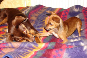 Beim spielen ist sie wacher und aufmerksamer geworden, gelegentlich braucht sie auch nicht aufgefordert werden, sondern fordert durch knurren und bellen ihre kleine Hundefreundin zum spielen auf.