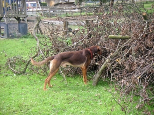 Bei Spaziergängen zeigt er Jagdtrieb, wenn Hasen laufen, auf dem Hof